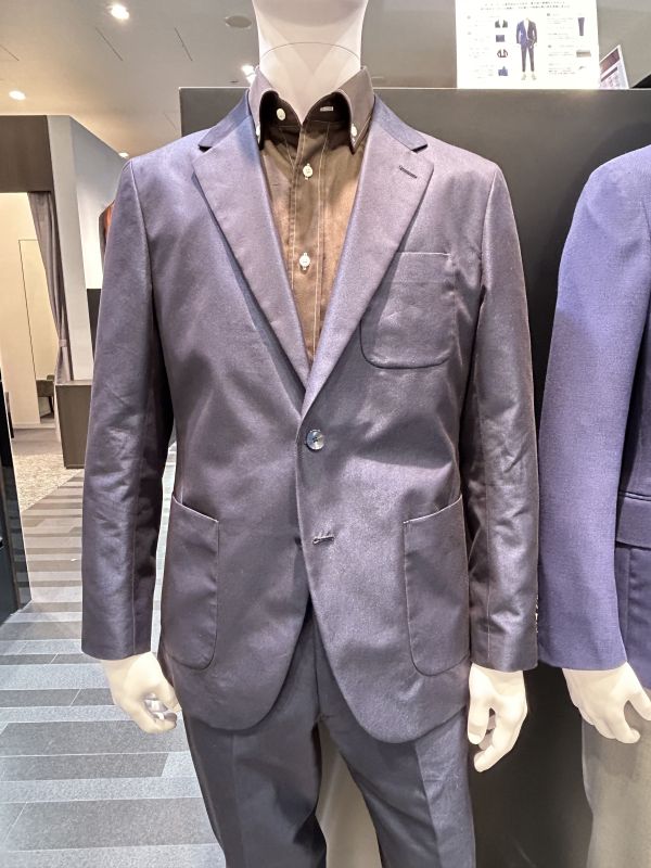 隣のトルソーは光沢が綺麗な生地で作られたセットアップを着ています。