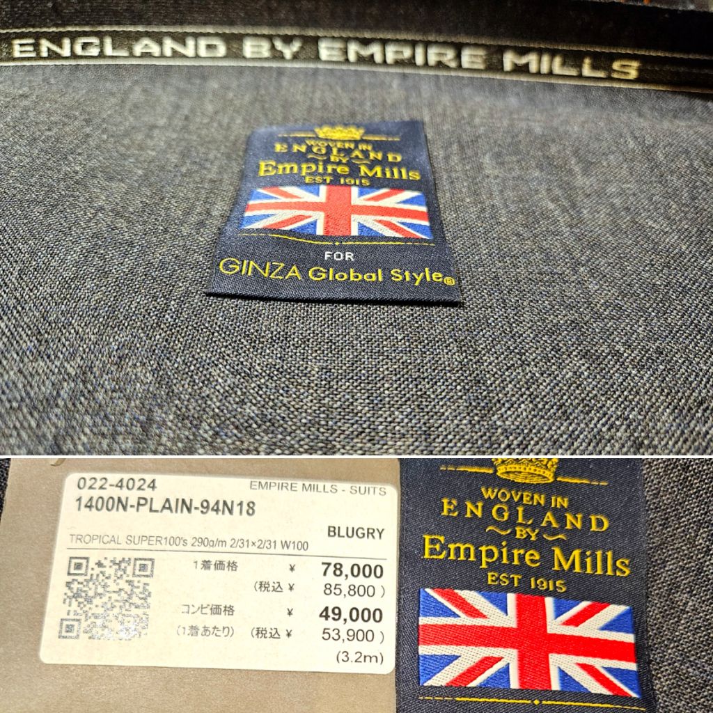 夏用としてオーダーしたエンパイア・ミルズのブルーグレー色です。