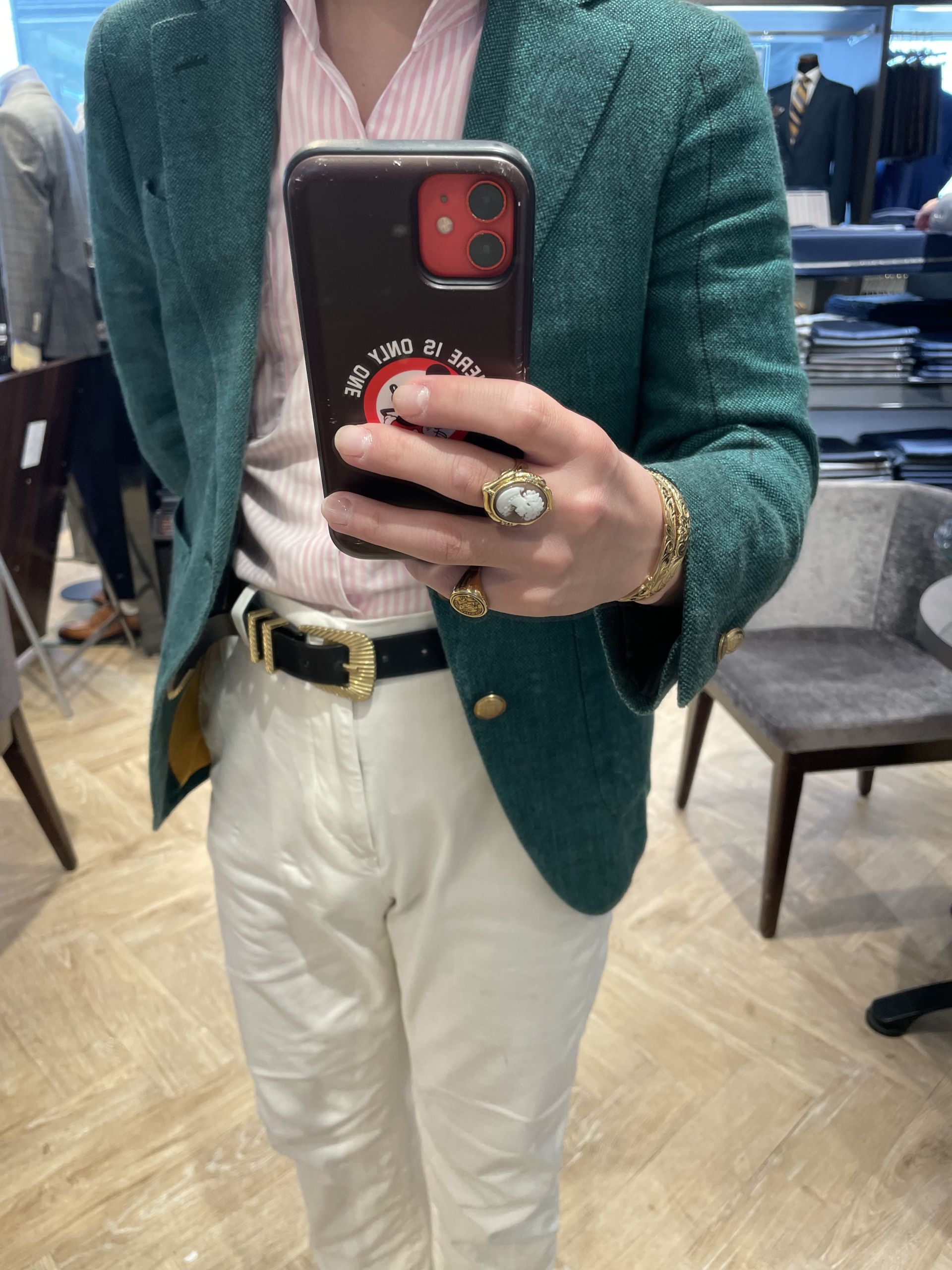 白のパンツと合わせると爽やかな印象で夏にオススメです。