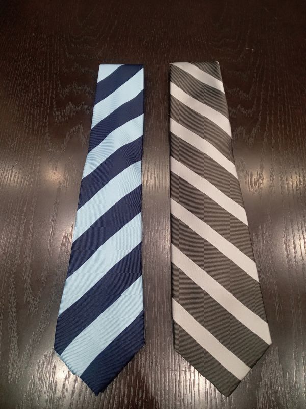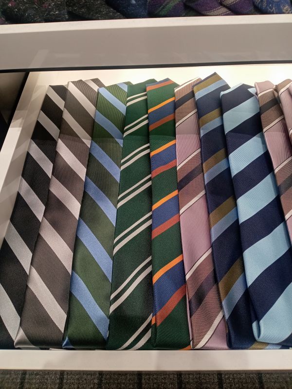 右側のグレーのネクタイがアメリカ式のレジメンタルタイとなります!