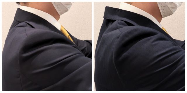 ここがしっかりと仕立てられているかどうかを見分けるには両腕を前に出して前習えの体勢になります。