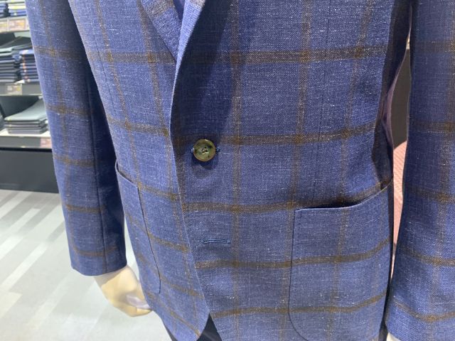 本日はショーウィンドウに新たに設置したブルーのウールジャケットについてご紹介します。