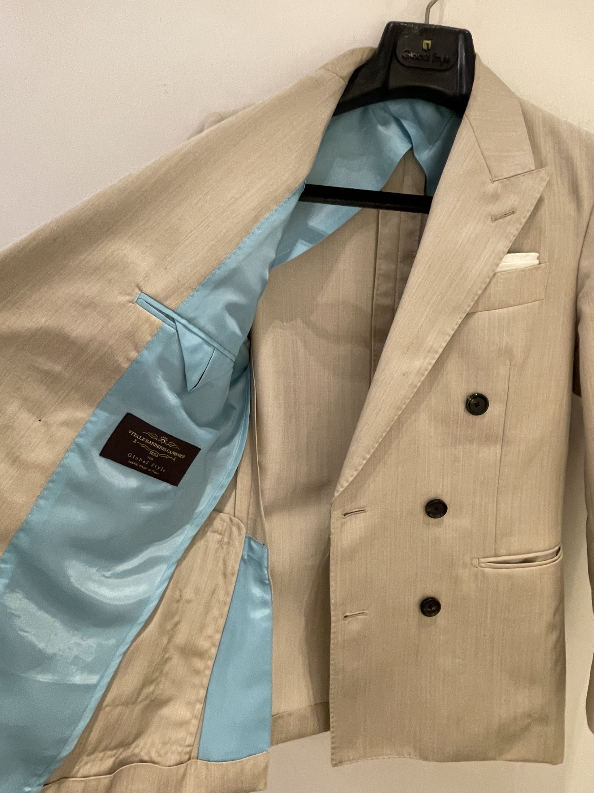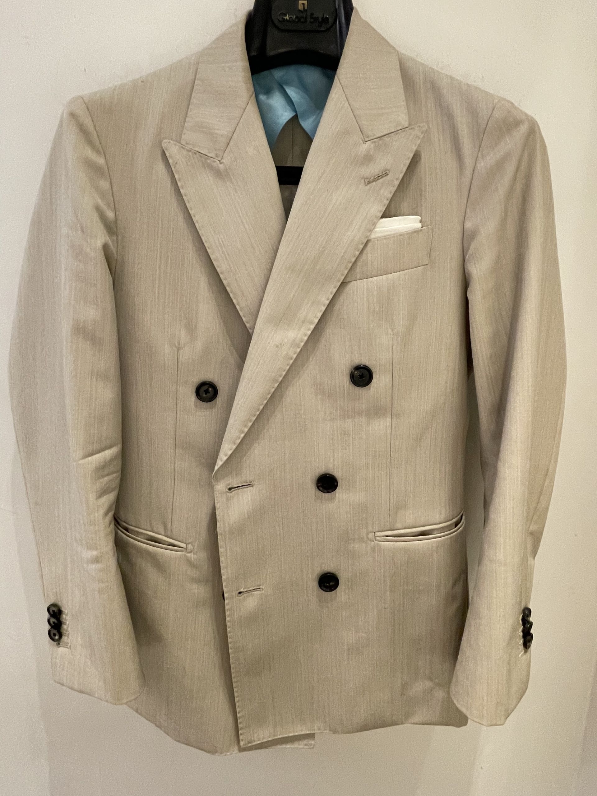 ジャケットの形は肩パットが無いアンコンモデルで軽さを演出しております。