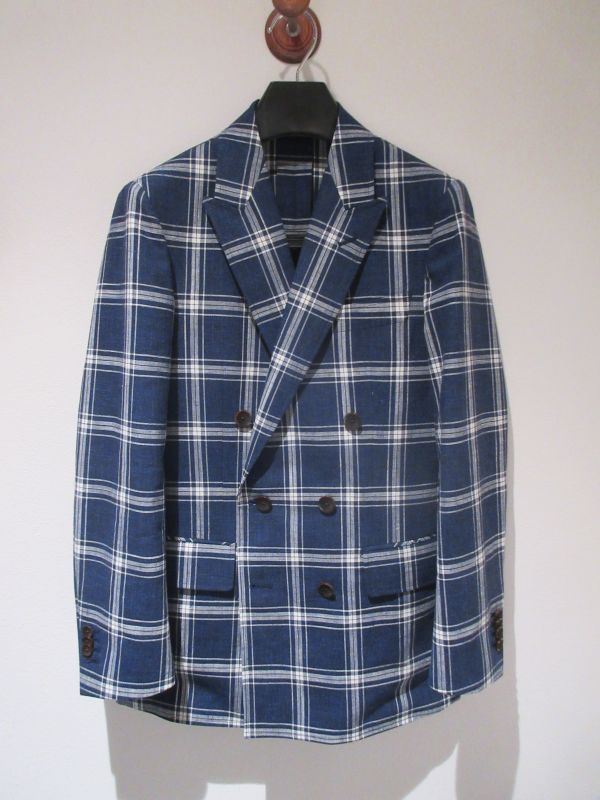 大柄のネイビーチェックの生地をダブルジャケットで仕立てました。