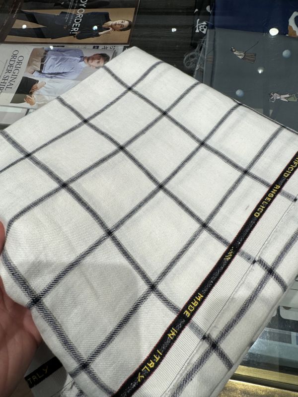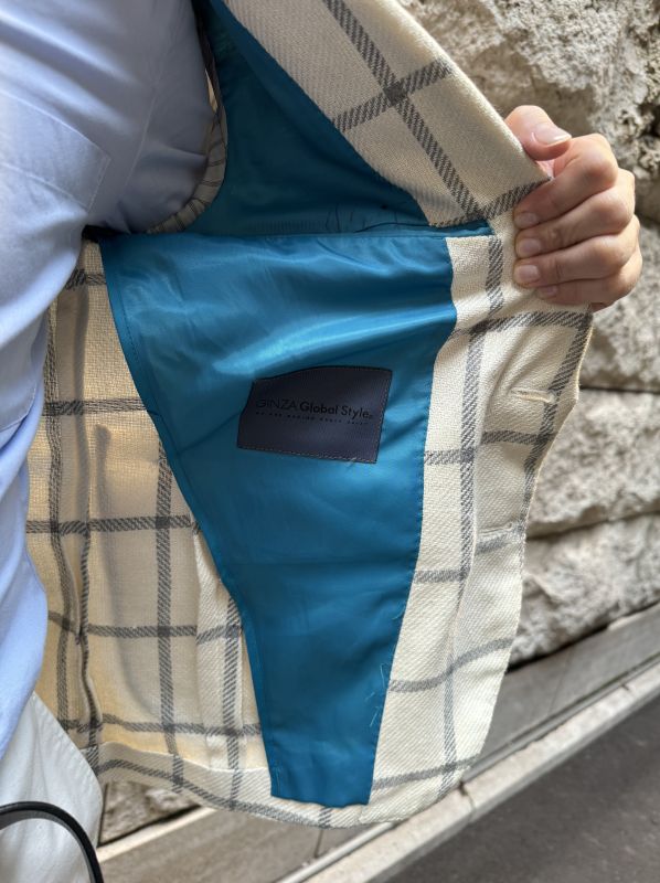 ジャケットは白でシャツを青にし、裏地も青にする事で