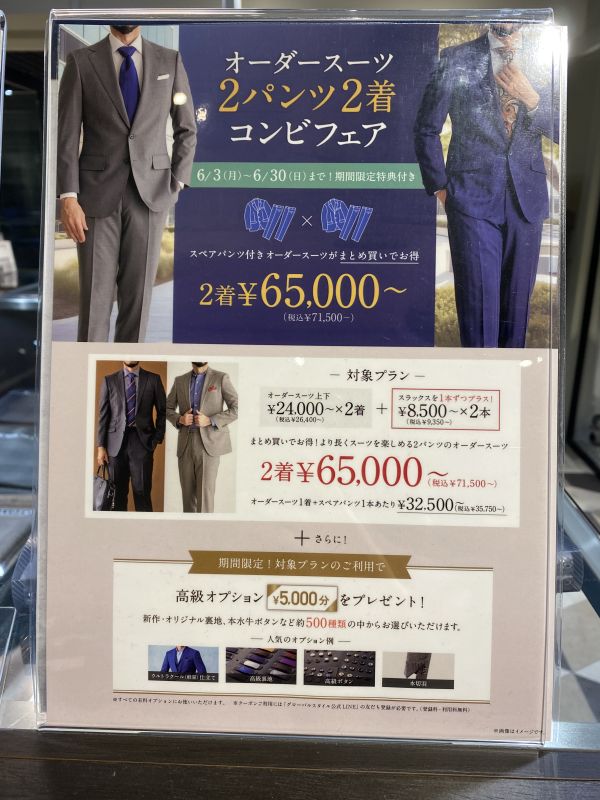 2着以上でコンビ価格(スーツ¥24,000‐+パンツ¥8,500‐)でご案内可能です!
