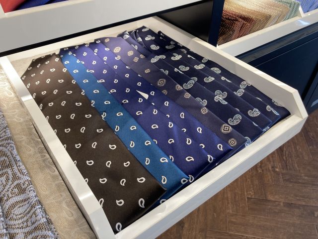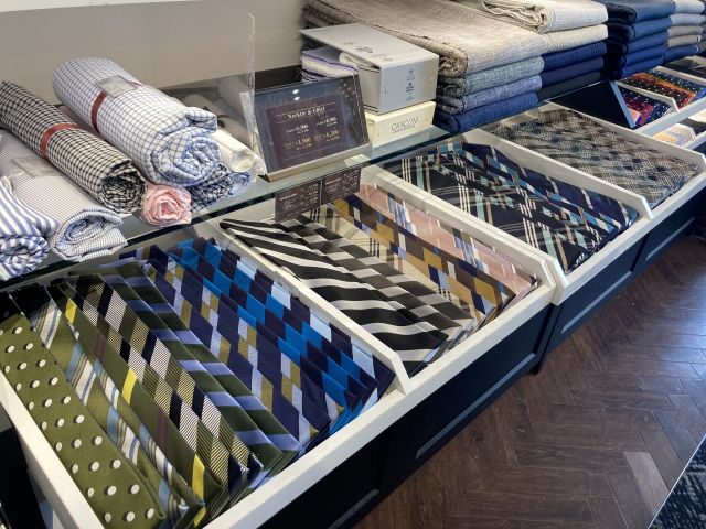 新宿3丁目店では、入口から正面左手側の、シャツ生地コーナーの下にネクタイがございます!