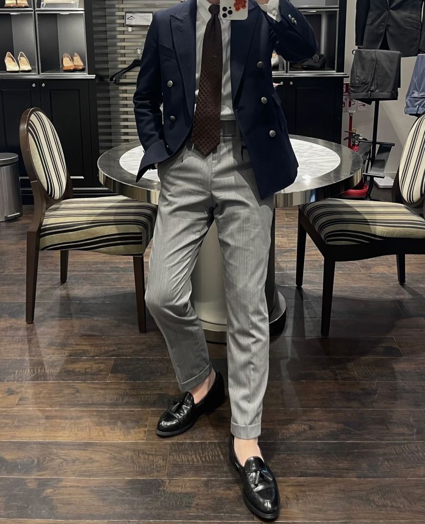 定番の紺色のブレザーにグレーのスラックス、ローファーの合わせです。