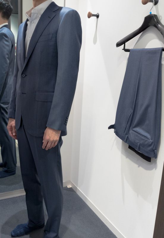 ブルーグレーは最近求められる方が多いですが、今回の生地は比較的落ち着いた色味でビジネスでも使いやすいです。