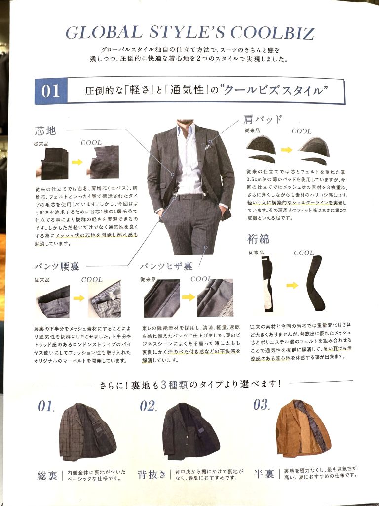 スーツには通常、芯材には毛芯が使用されておりますが、これからのシーズンには写真のようなメッシュタイプの芯に変更すると、より快適にスーツをご着用することが出来ます!