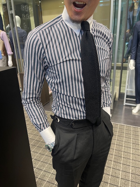 衿型をタブカラーにすることにより、ネクタイの立体感、首元の締まり具合が