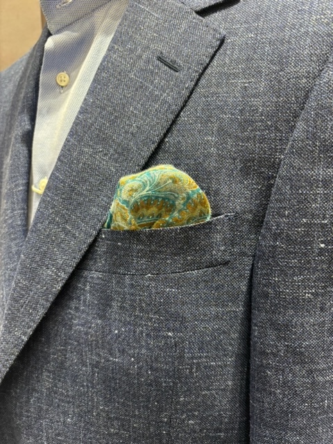シャツはサックスブルーですが、チーフはグリーンをミックスしたターコイズと、これまた同系色でまとめております。