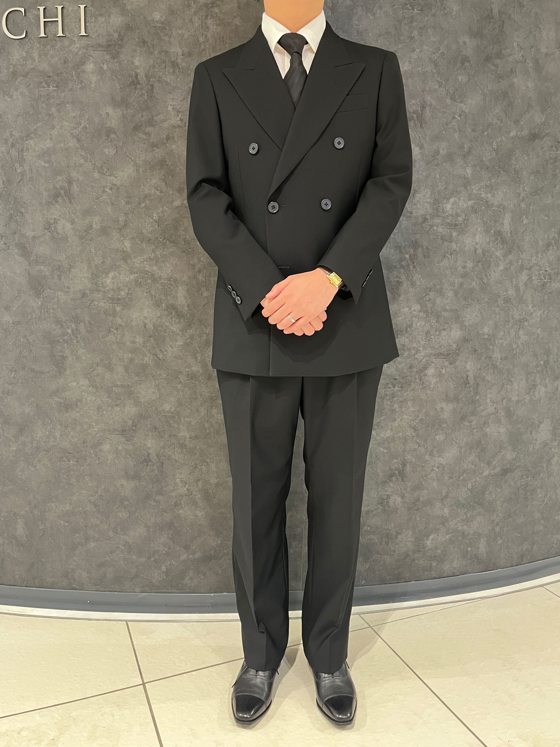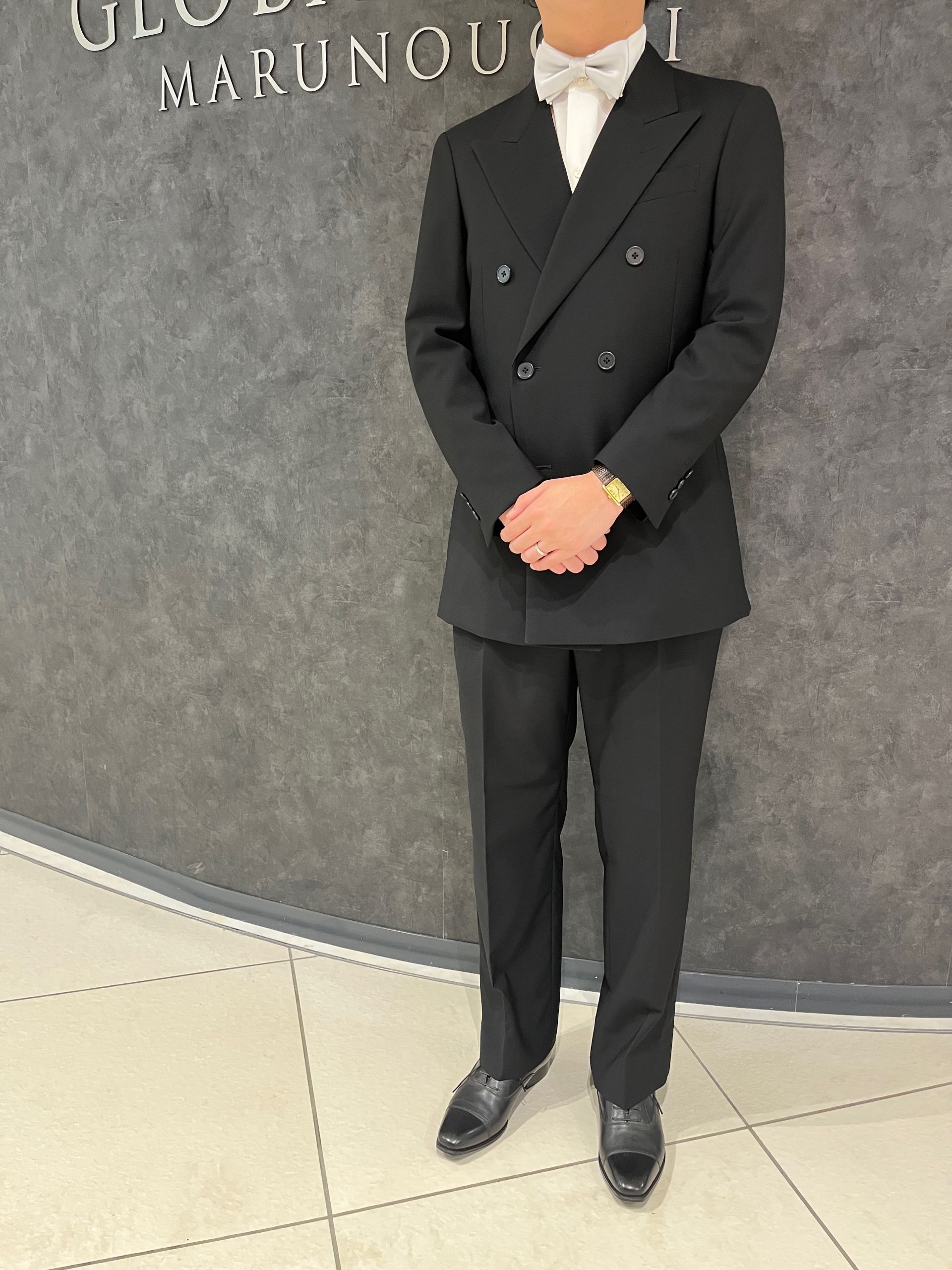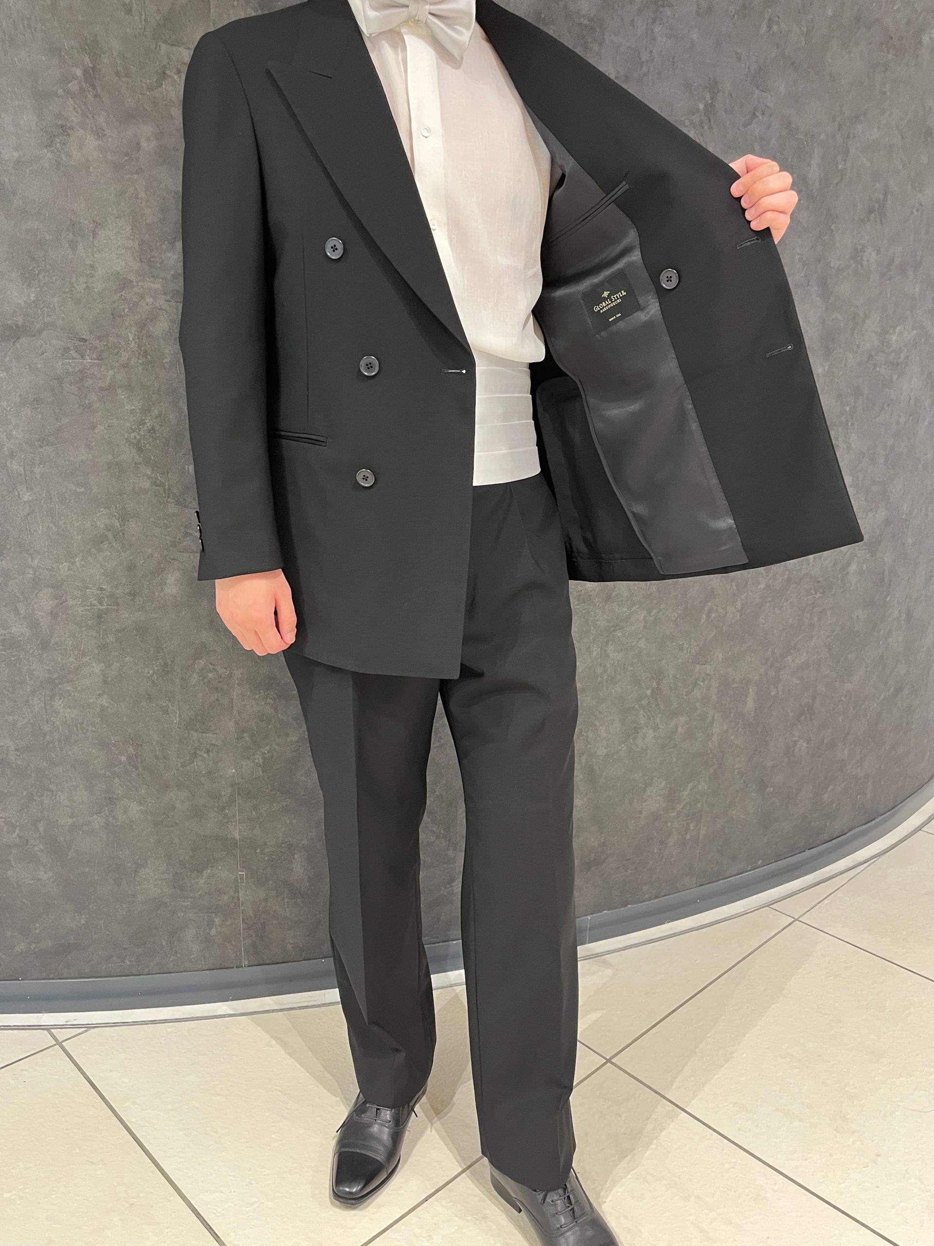 グローバルスタイルで仕立てた礼服用のブラックスーツです。