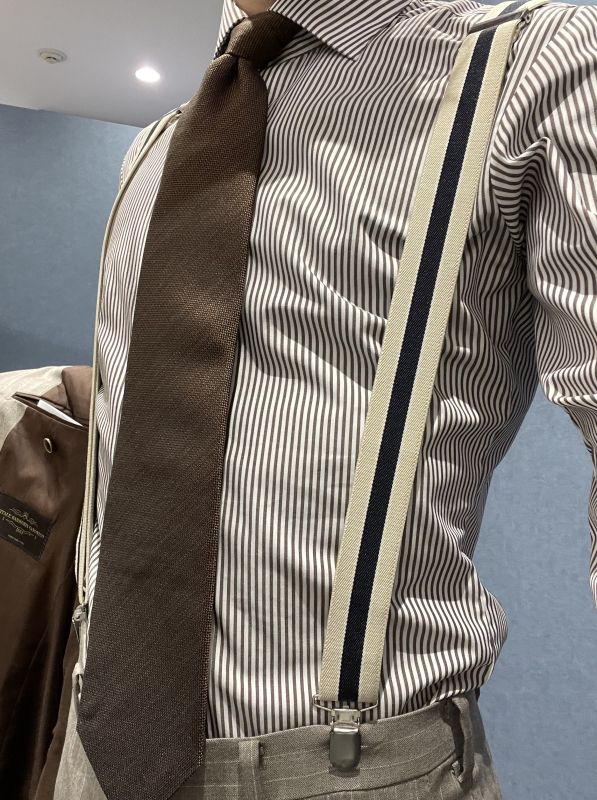 イギリスのスーツの主流は “スリーピース” となり、サスペンダーはベストとシャツの間に使用。基本的には、見せない(隠す)アイテムとなります。