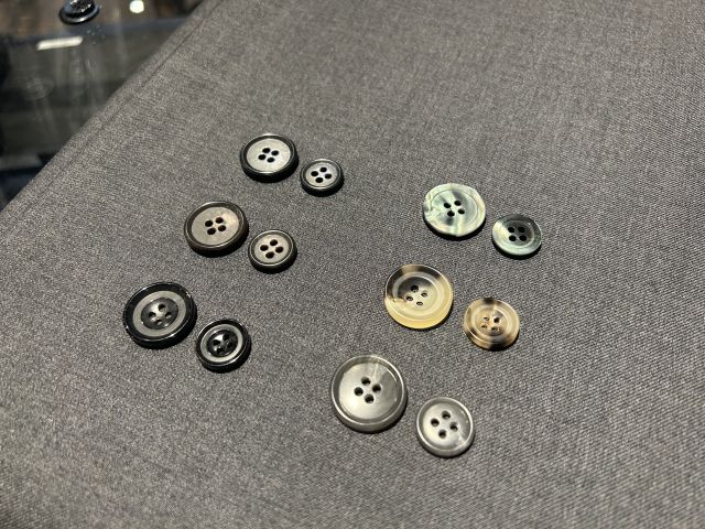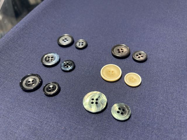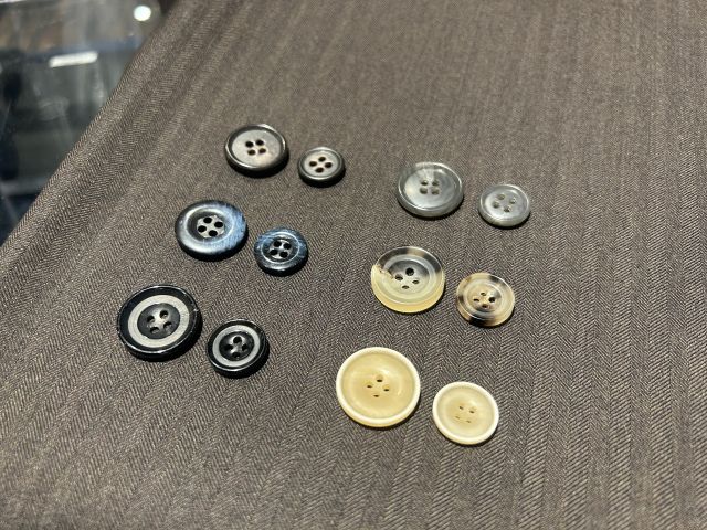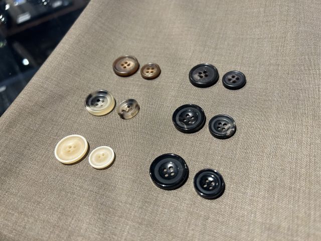 釦はブラック系や同系色はもちろん、やや明るくなるベージュ系の釦、こちらもやや派手にしてグリーンの釦のなかなか綺麗に合わせられます。