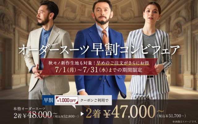 フェアの内容としましては、オーダースーツ2着以上ご注文の方に限り、