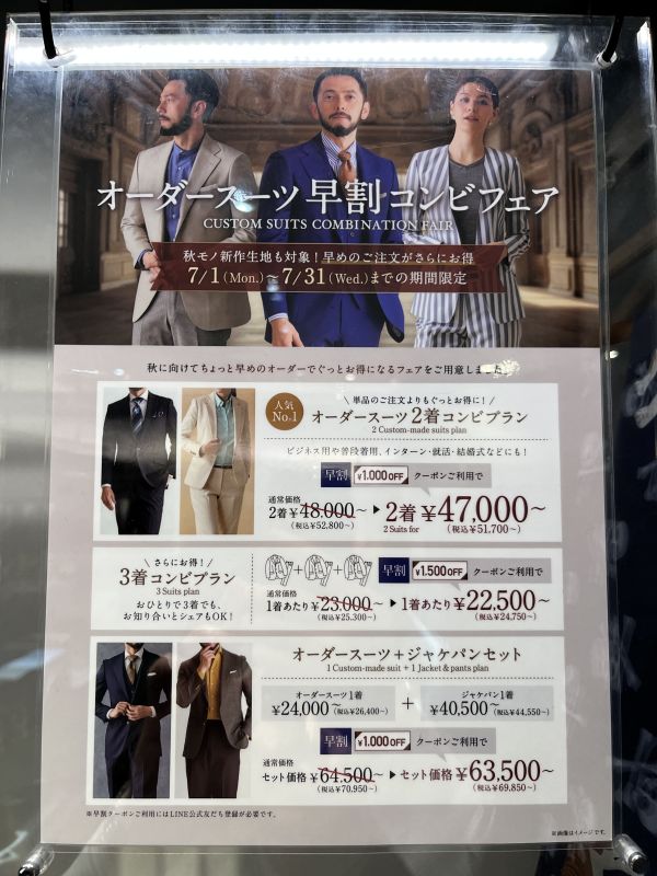 さらに、スーツ2着以上お買い上げで、LINEの友達追加いただくと¥1000分クーポンご利用でお値引きも!!!