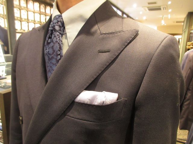 シャツ・チーフ・ネクタイも全てブルー系統でまとめた青一色スタイル、いわゆるトーン・オン・トーンなスタイルです。