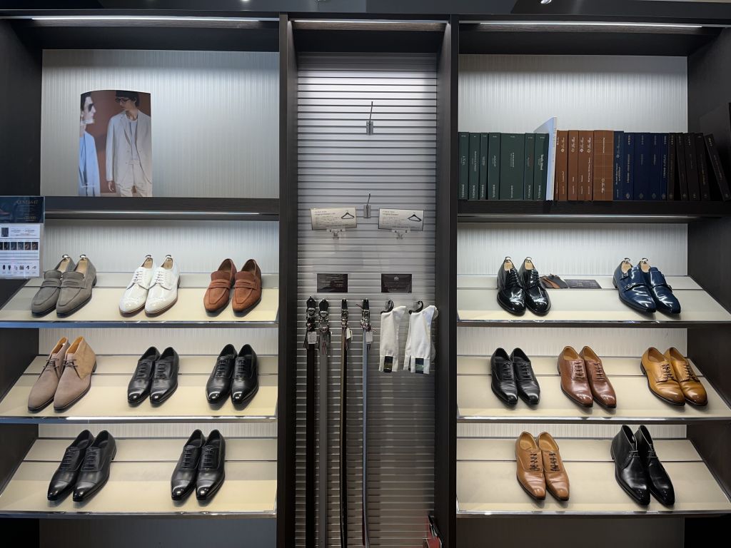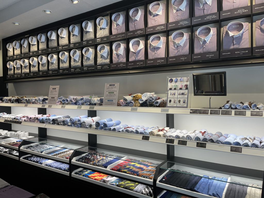 入口右側にはシャツ生地やネクタイ、その他にもポケットチーフやサスペンダーなど数多く品揃えしております!