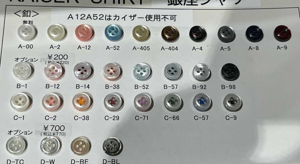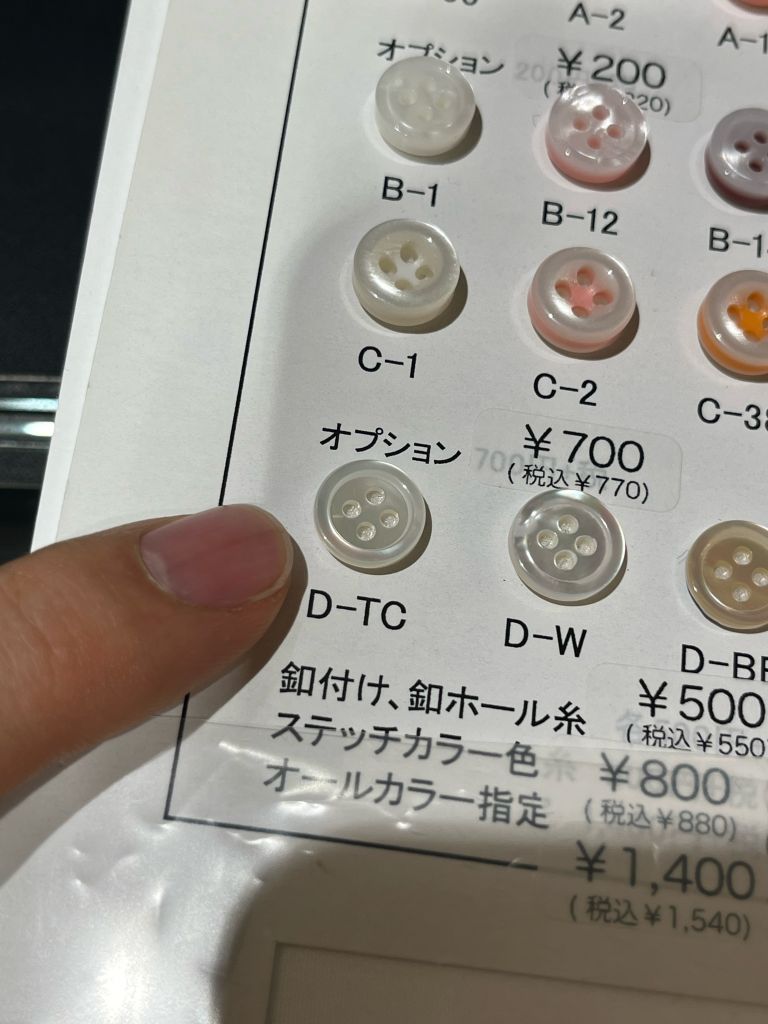 色が付いた釦だと派手すぎかな?でもせっかくのオーダーだし色付きじゃないともったいないかな…