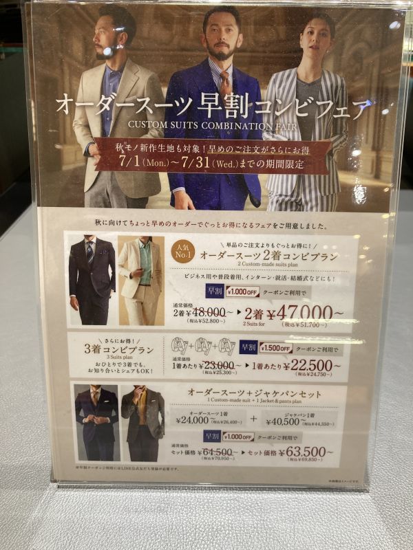 お好きな生地で上下スーツ2着選んで頂いたお客様対象で、LINE公式友達登録で獲得できる早割クーポンを使用で¥1,000OFFとなります!