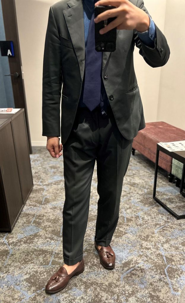 ドーメルの濃い目のグリーンスーツです。ビジネス的にも使いやすい配色で、このシリーズは”エクセルブルー”という名前のものです。