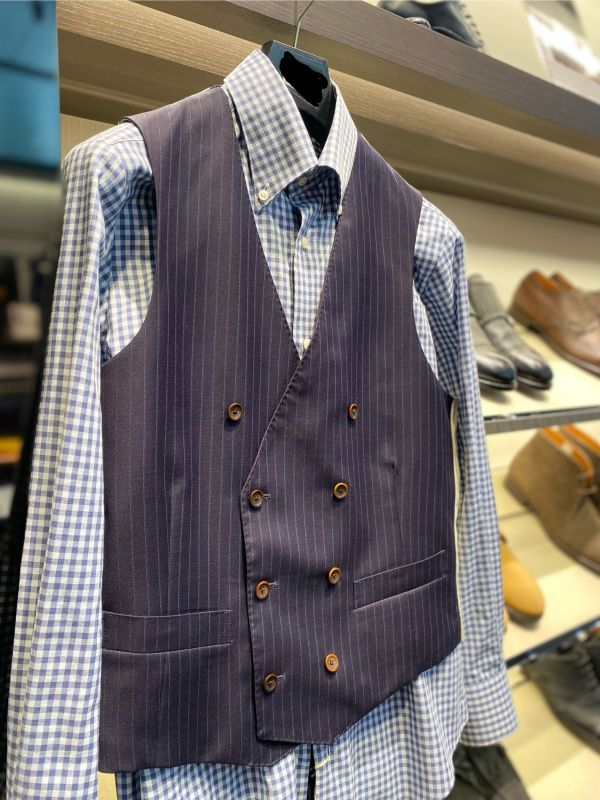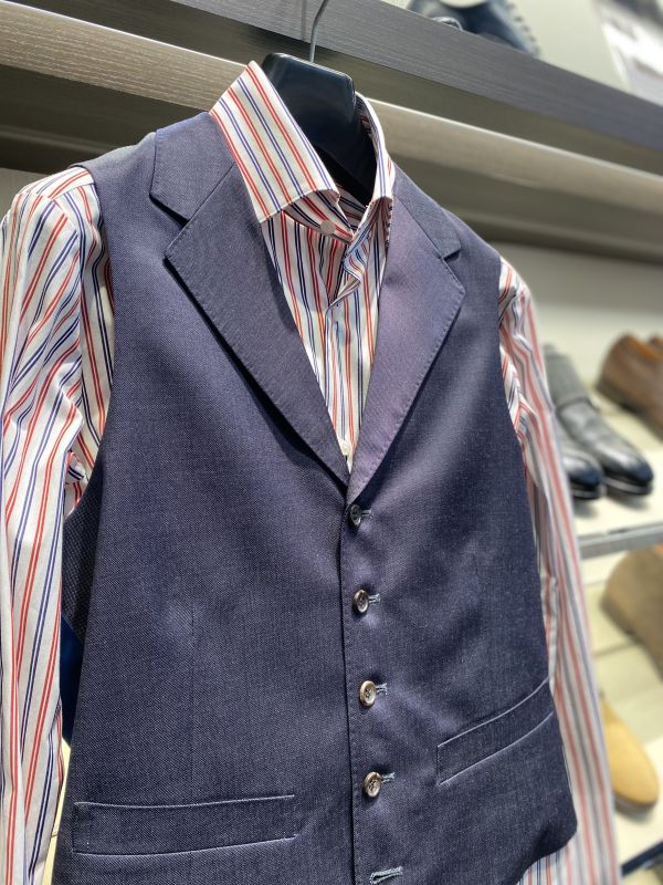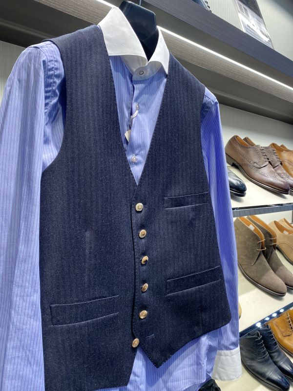 シャツにベストを合わせるだけでジャケットが無くともカチッとした印象になります。
