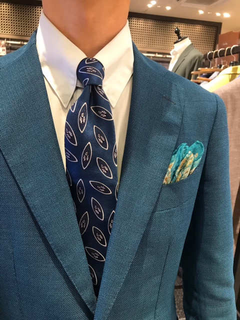 ジャケットとネクタイとチーフはターコイズのトーン・オン・トーン、シャツとネクタイの幾何学模様はサックスブルー、