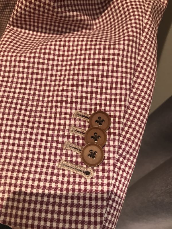 赤ギンガムチェック柄なのでジーンズやジャケパンスタイルとして