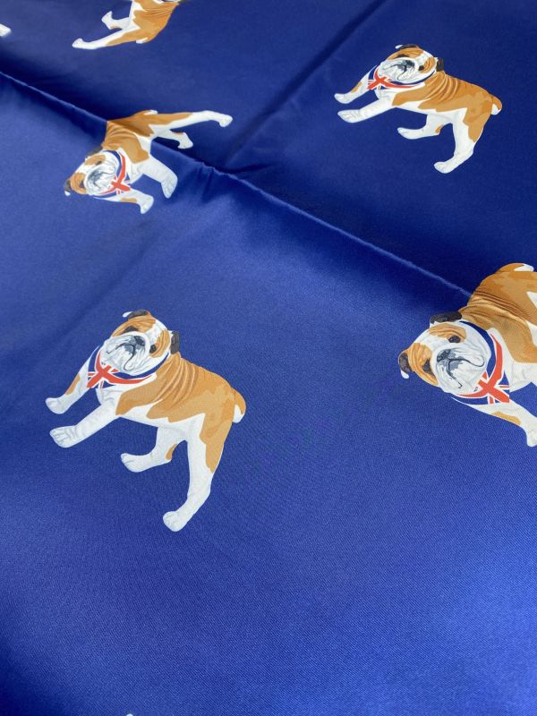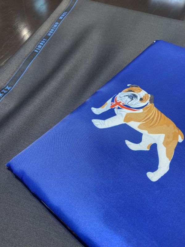 光沢の美しいドーメルのブラウンスーツにワンちゃんの裏地。