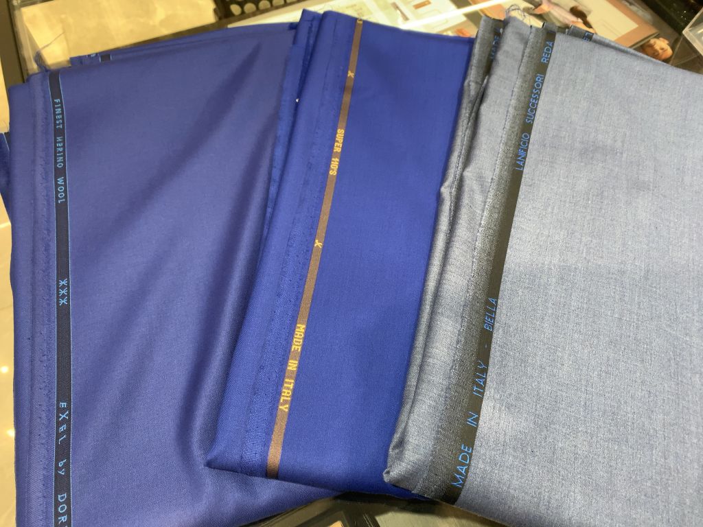 左の鮮やかなブルーの生地はドーメルというフランスのブランド生地です。
