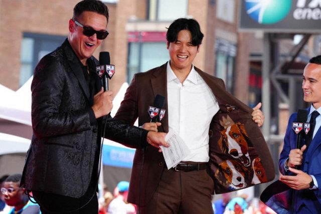 大谷選手はブラウンのスーツを着用されなんと裏地は愛犬のデコピンでした