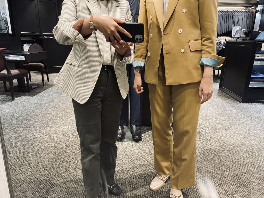 対する谷垣さんは、爽やかな黄色のダブルジャケットのメンズライク風コーデ★