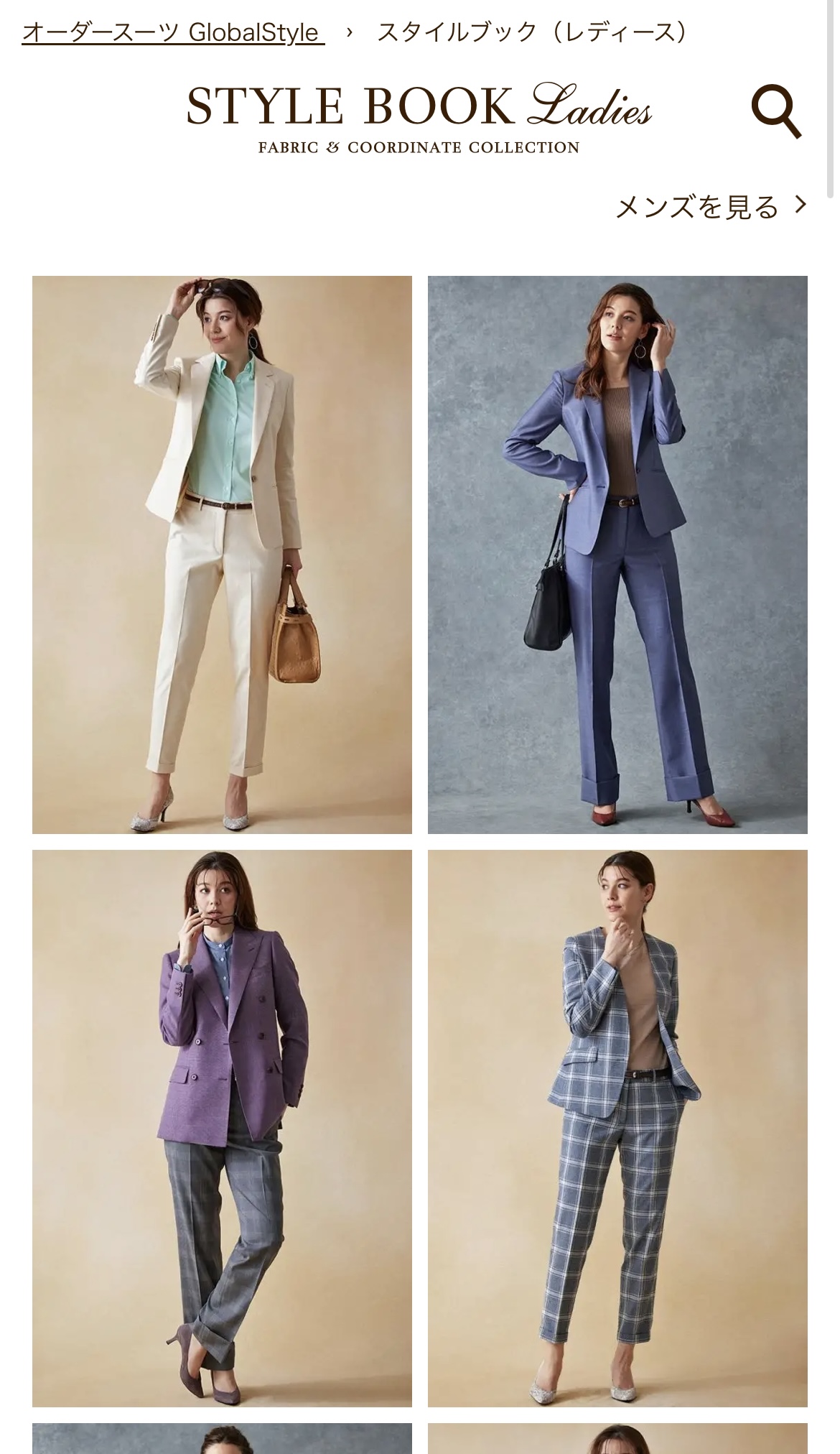 このページでは、実際に店頭に並んでる生地で作ったスーツのイメージを見ることができます。