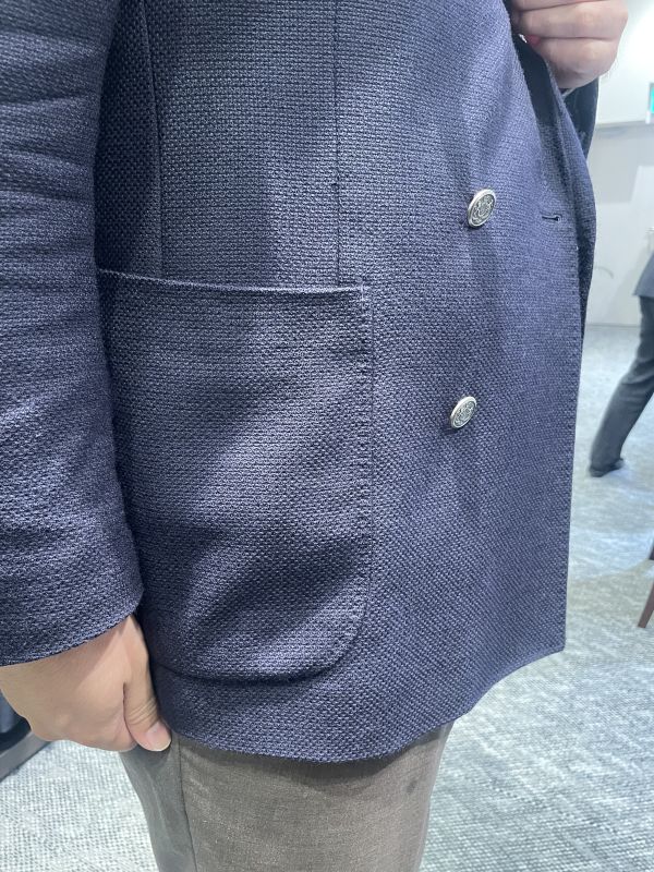 銀のメタル釦で合わせて、ポケットは大きくアウトポケット