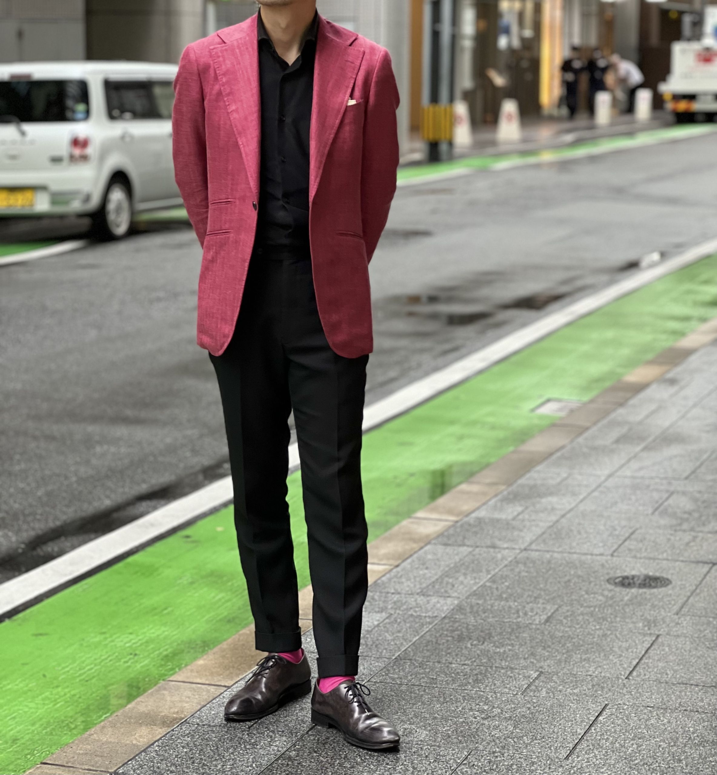 先日のブログでも掲載しましたが、スラックスのラインはルーズになりすぎないようにセミフレアでドレス感を意識すること。