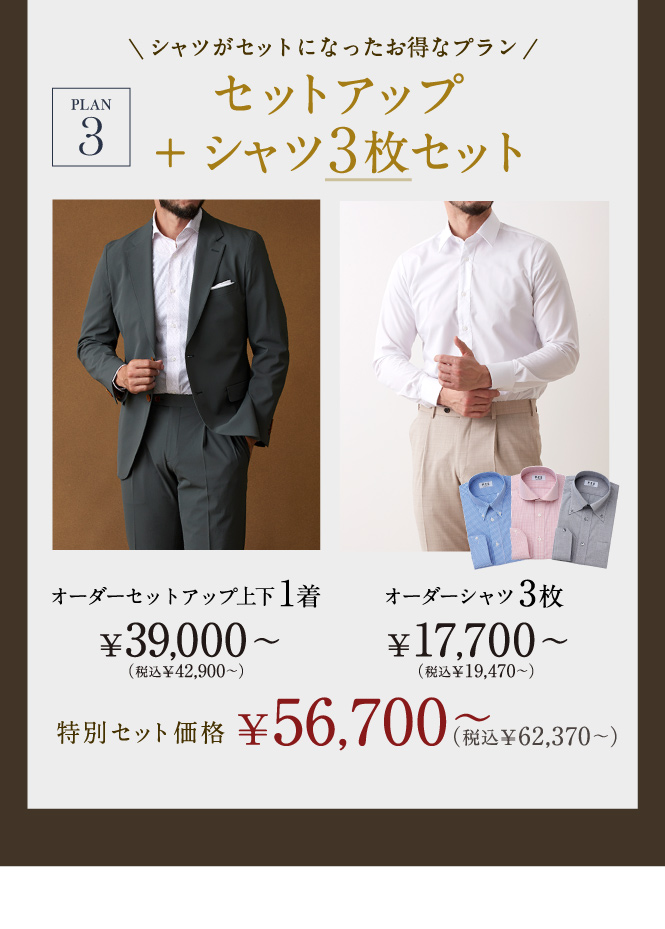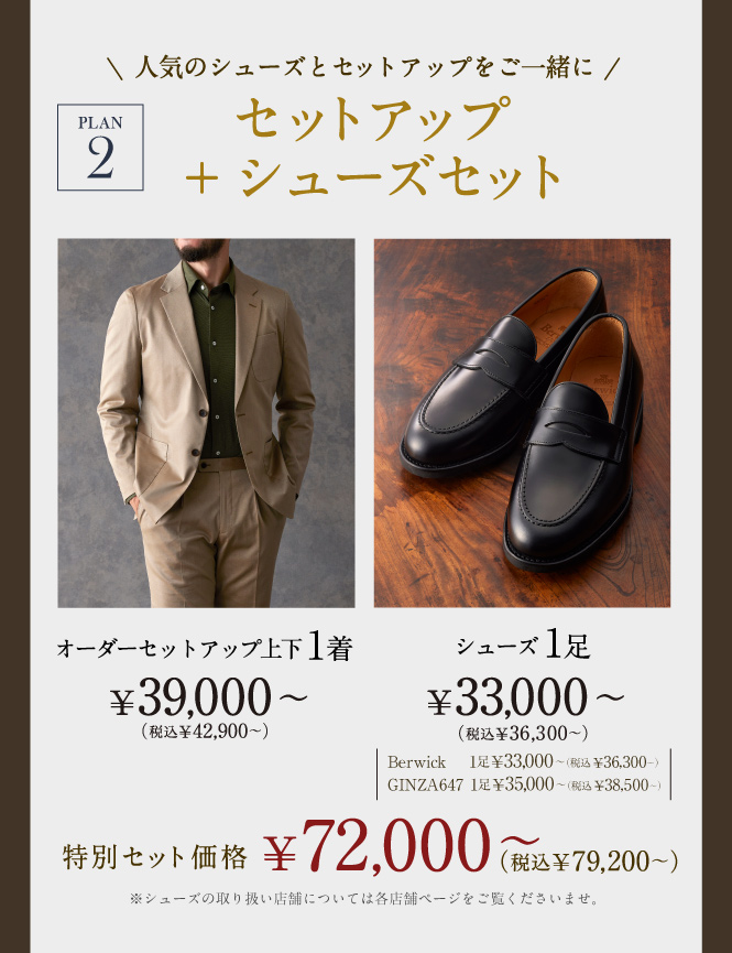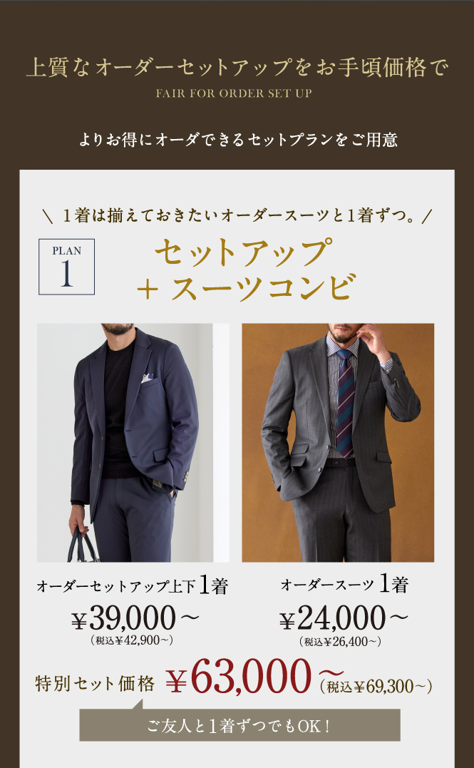 今月のフェアでセットアップとスーツなどを組み合わせてご購入いただくと、