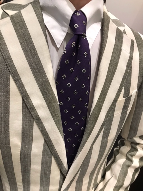 ヘンリーロイヤルレガッタでは同じレジメンタルのネクタイで合わせる事が多いですが、ここはあえて小紋柄です。