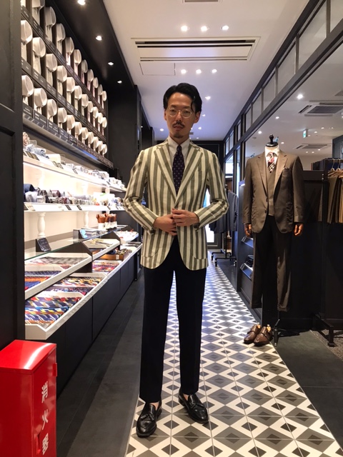 店頭に立つ身ではありますので、スラックスはネイビー・シューズは黒と、上半身に対して下半身はカチッっとしております。