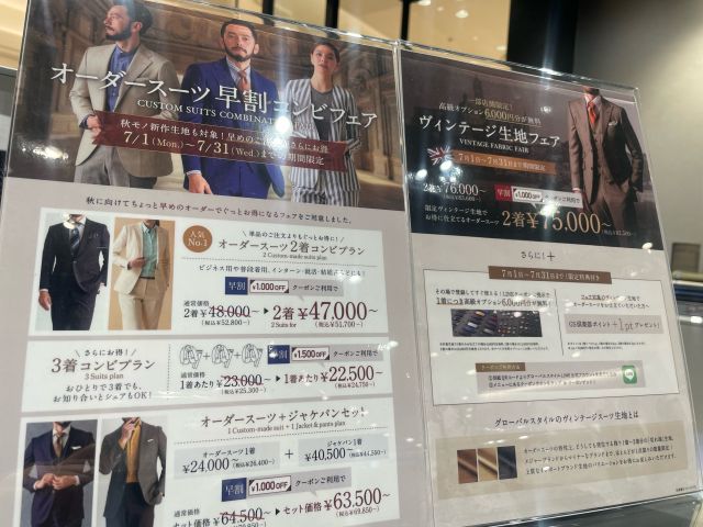スーツ2着¥1,000OFF+1着につき¥6,000円分オプション無料