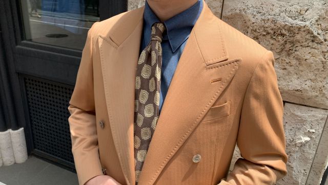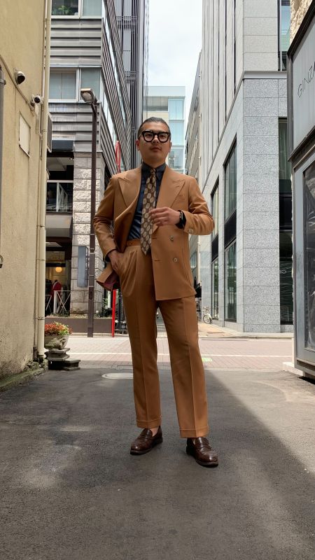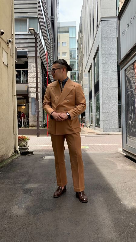 ダブルスーツをセレクトし脇ポケットはアウトポケットを採用し