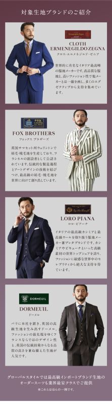 エグゼクティブ層に人気のあるラグジュアリーブランドの新作生地でお得にお仕立ていただけます。