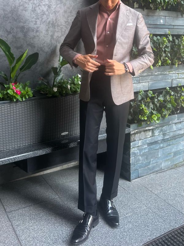 ワイシャツはオープンの襟型で首元を開き、涼しげな雰囲気ですね!