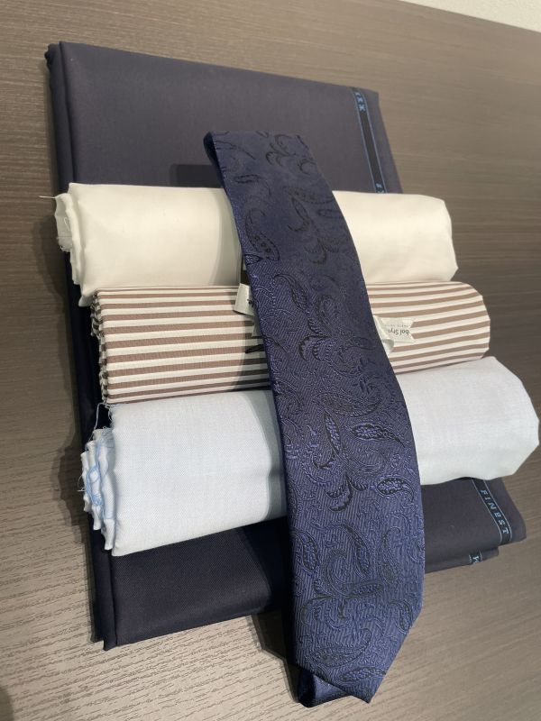 下の生地がスーツ生地、上の細巻の生地がシャツ生地となっております。