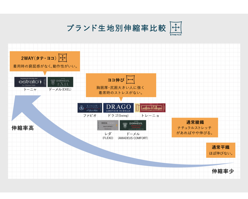 以上、代表して2つのブランドでご紹介しましたがストレッチが効く生地はほかにもございますので