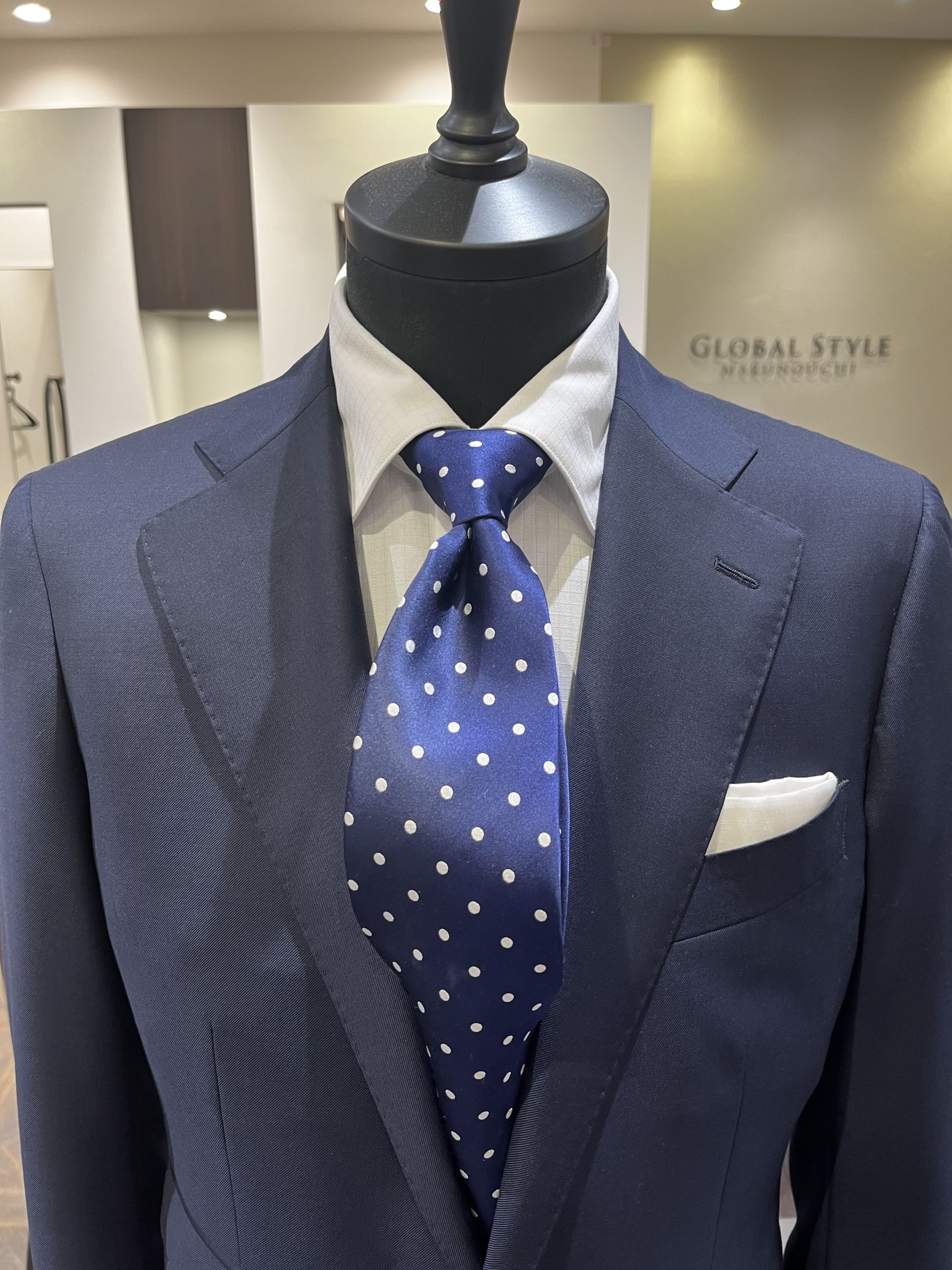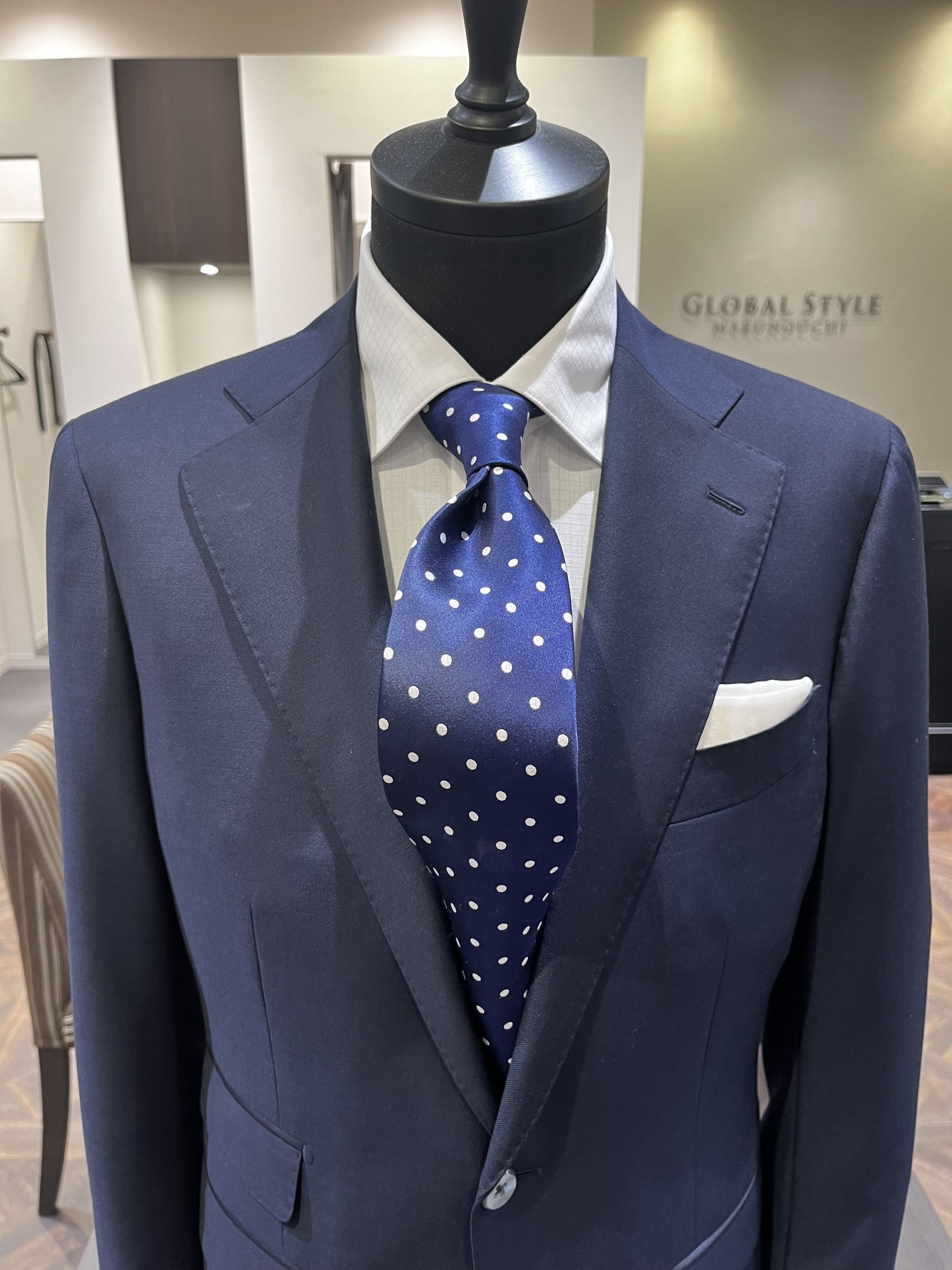 近年のスーツの傾向として、肩のラインがナチュラルでシルエットも細身のものが多くなっており、スーツ全体のバランスが一番取りやすい為、プレーンノットで結ぶことが非常に多いです。