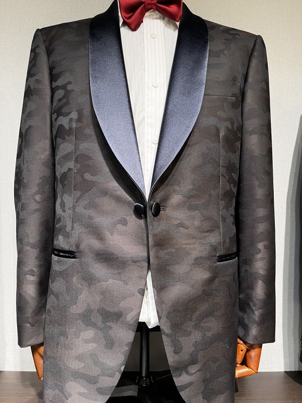 所謂「へちま襟・一枚襟」と呼ばれるサテン地のショールカラーで、写真は迷彩柄と珍しいですが黒無地でお仕立てをすることが多いです。