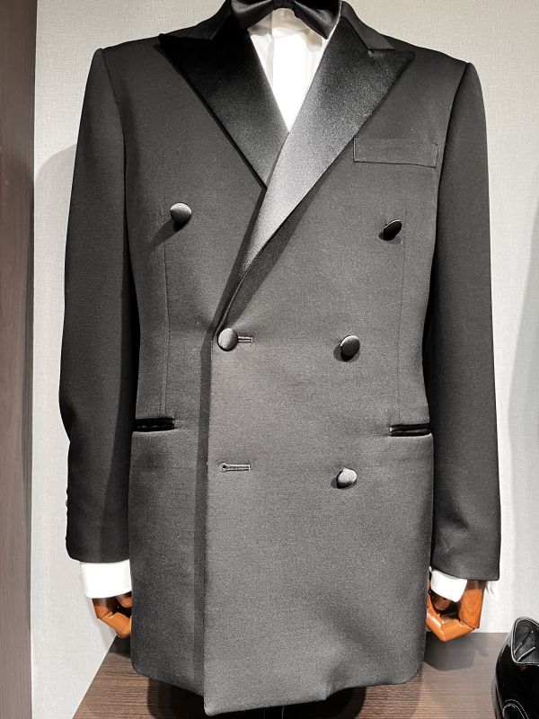 ダブルジャケットの場合は必ずピークドラペルになるのですが、シングルタキシードでもピークドラペルの方がフォーマル度が高くなります。