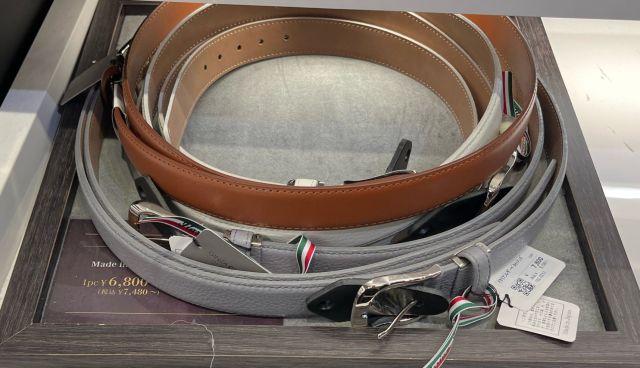 自社製のイタリアンレザーベルトの、グレー、ブラウン、ホワイト、