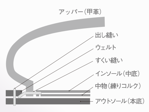 マッケイ製法:シンプルな構造上、ソールの返りが良く、どんな柔らかい革でも靴にできる製法です。